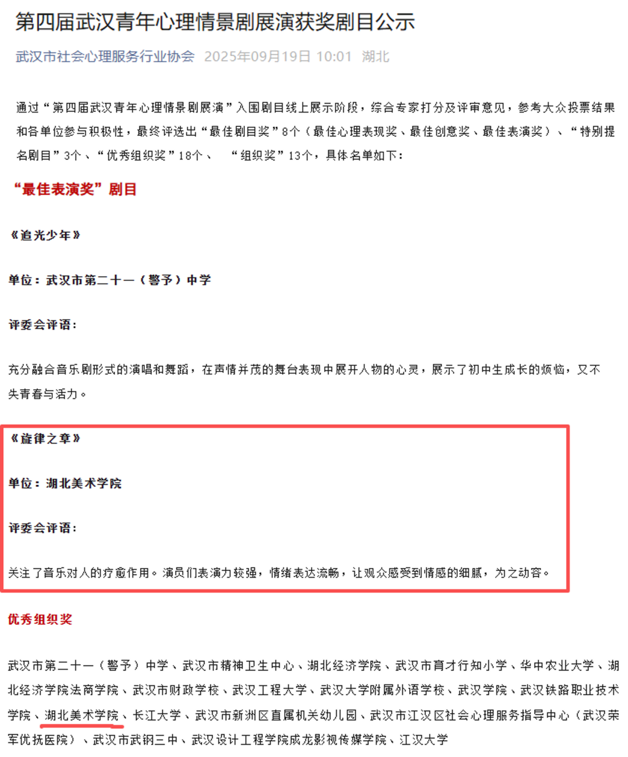 近日,由武汉市精神文明建设办公室、武汉市卫生健康委、湖北省心理学会联合主办的第四届武汉青年心理情景剧展演结果揭晓。影视动画学院选送的心理情景剧《旋律之章》从全市各行业团体报送的50多部作品中脱颖而出,荣获“最佳表演奖”。湖北美术学院获“优秀组织奖”。