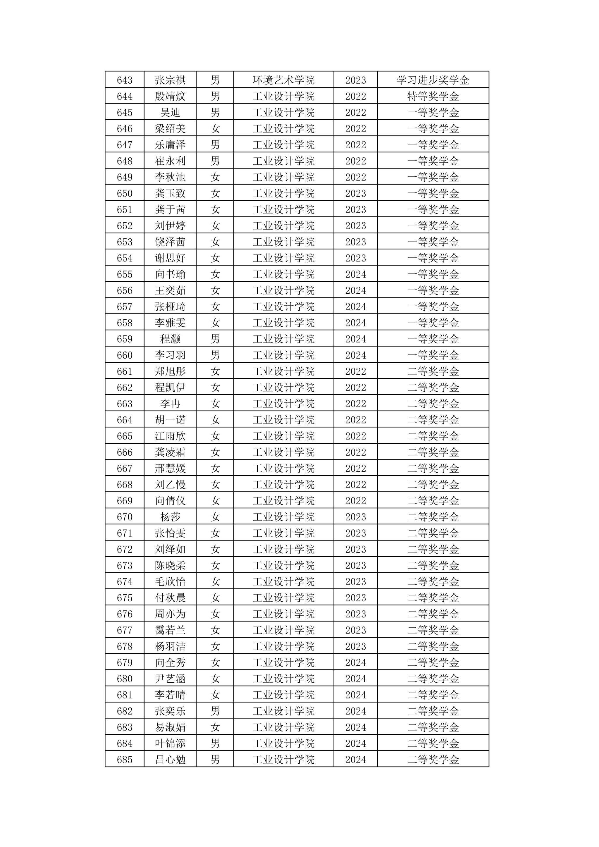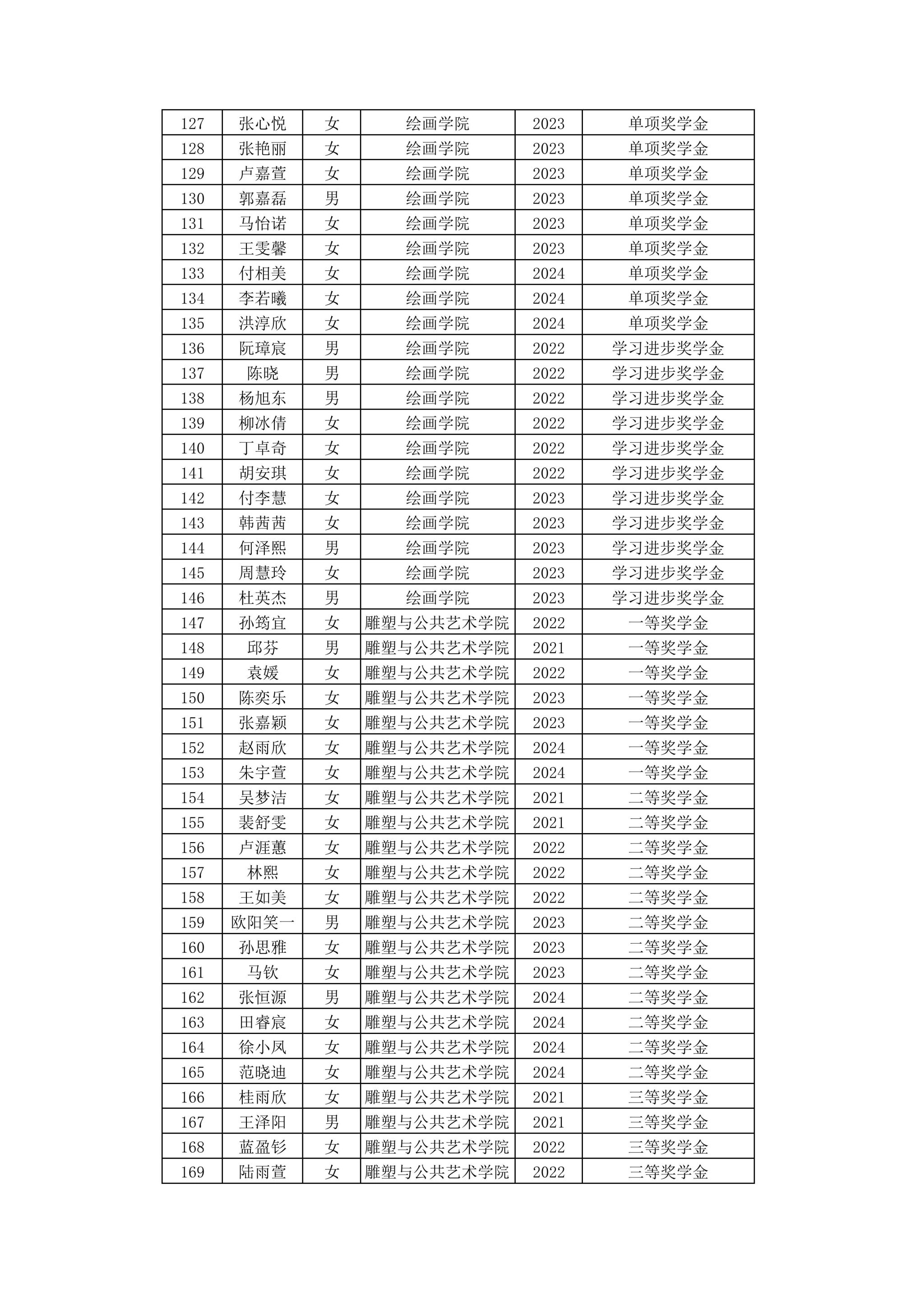 为全面贯彻党的教育方针,落实立德树人根本任务,深化教育评价改革,鼓励学生奋发向上、刻苦学习、努力实践、勇于创新、全面发展,根据《湖北美术学院关于开展2024-2025学年本科生奖学金评定工作的通知》(湖美学字〔2025〕20号)要求,各二级学院完成了初评工作,经党委学生工作部审查,校学生资助工作领导小组开展特等奖学金差额评审,拟定何欣悦等10名同学获得特等奖学金,尚秦琳等146名同学获得一等奖学金,甄海轩等261名同学获得二等奖学金,杨子欣等261名同学获得三等奖学金,王雯轩等104名同学获得单项奖学金,徐静怡等69名同学获得学习进步奖学金,具体名单附后(见附件)。