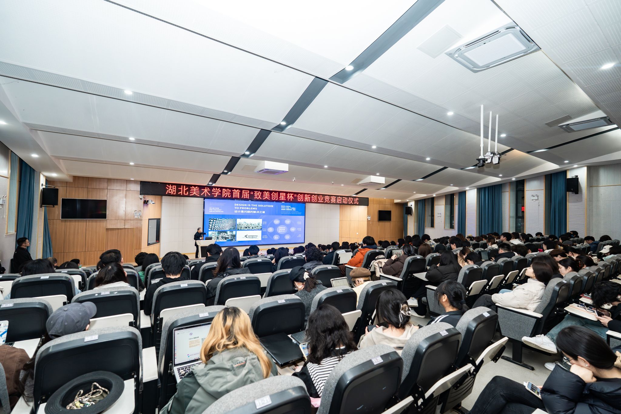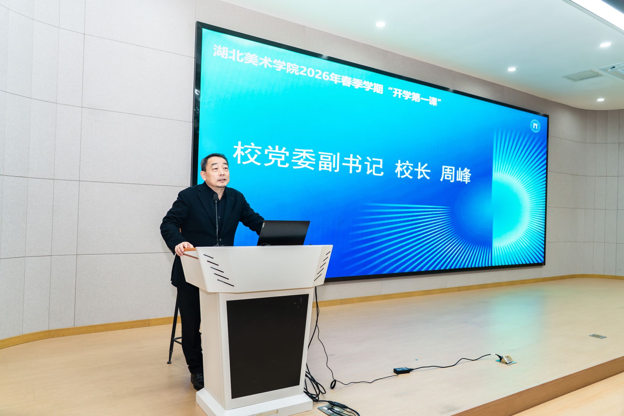 课堂上,周峰立足学校“1+2+X”三位一体人才培养模式,结合自身深耕艺术设计与创新创业领域多年的实践经验,从人才培养、个人成长、创新实践三个维度,为青年学子明晰成长路径、指引前行方向。他强调,设计不仅是一门技艺,更是一份责任与担当;不仅是解决问题之道,更是传递温度的载体。他寄语新时代艺术人才,要主动打破学科壁垒,坚持跨学科、跨专业融合发展,推动艺术、科技、产业深度协同,践行以人为中心的服务设计理念,在协同共创中实现艺术价值与社会价值的有机统一,让设计真正赋能生活、温暖社会。